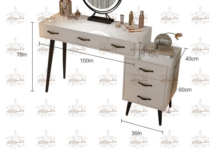 طول میز آرایشی 136 سانتی متر، عرض آن 40 سانتی متر و ارتفاع آن 78 سانتی متر برآیند شده است. در صورتی که علاقهمند به تغییر ابعاد میز هستید، این امکان را دارید تا از طریق واتساپ با پشتیبانان مجموعه دکورآرای در تماس باشید و ابعاد و اندازه مورد نظر خود را با آنها هماهنگ کنید تا برای شما به صورت سفارشی تولید شود. لطفاً در نظر داشته باشید که هرگونه افزایش ابعاد با اعمال هزینه اضافی همراه خواهد بود.